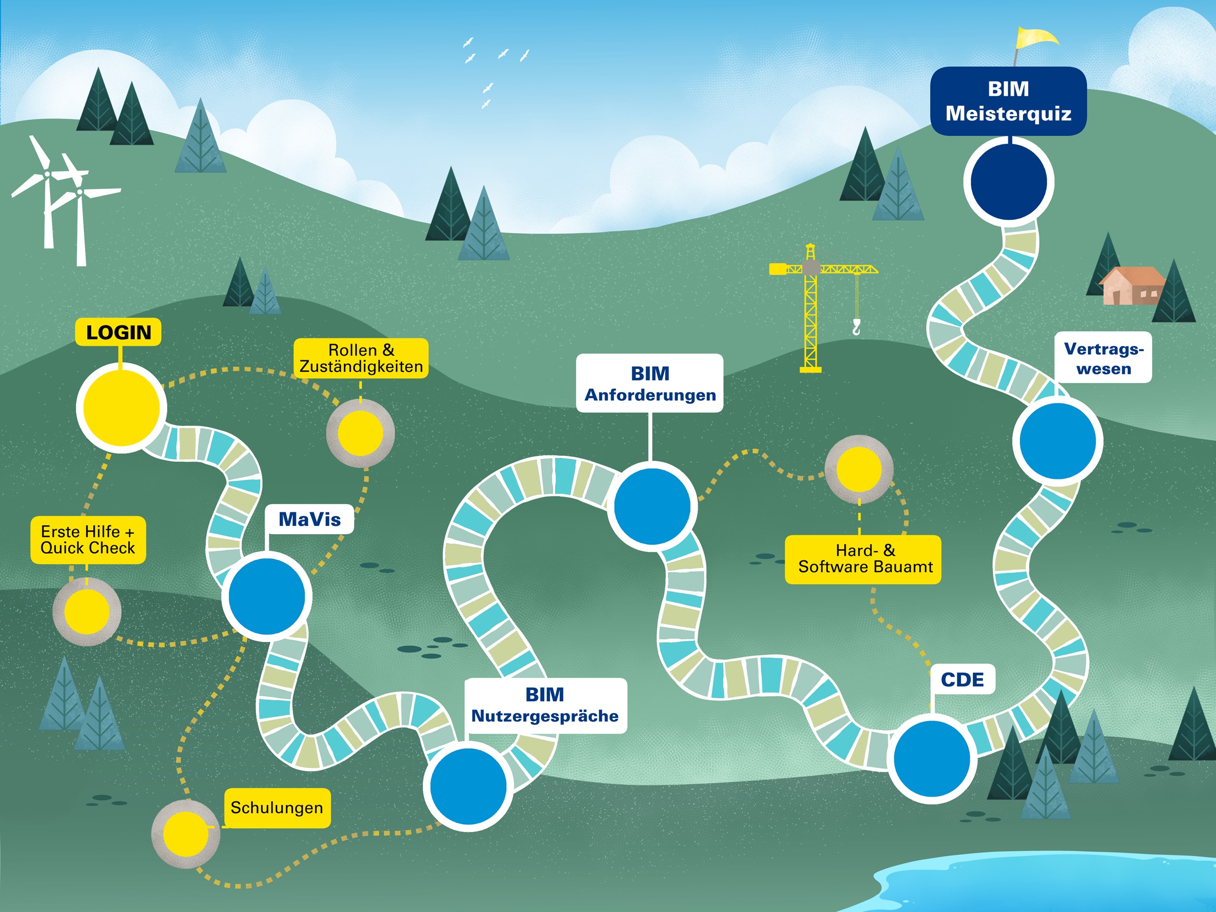 Hilfe naht! Das E-Learning "Dein Weg zum BIM-Projekt" begleitet dich und dein Projekt vom ersten Schritt an mit passenden Informationen und folgenden Lerneinheiten.